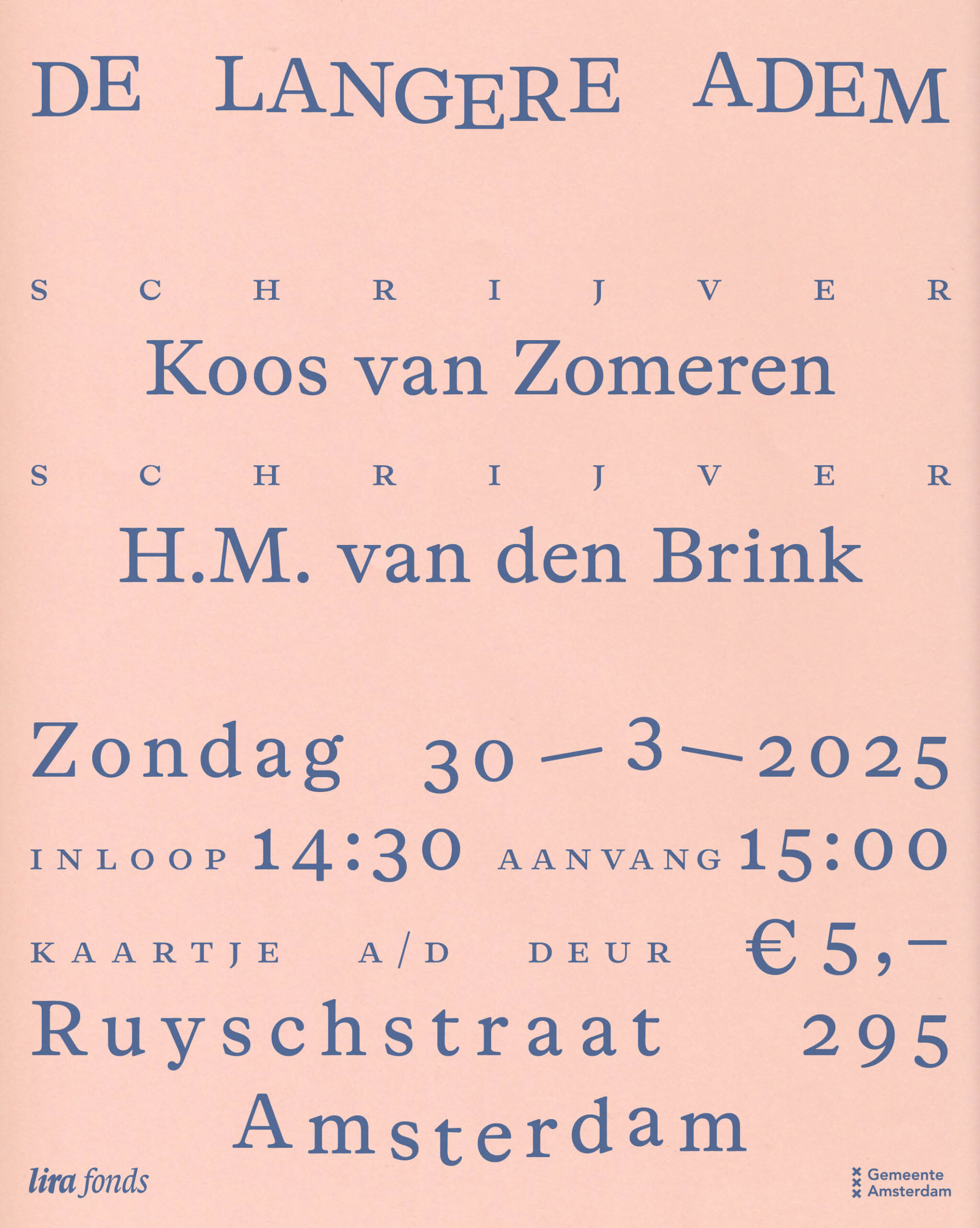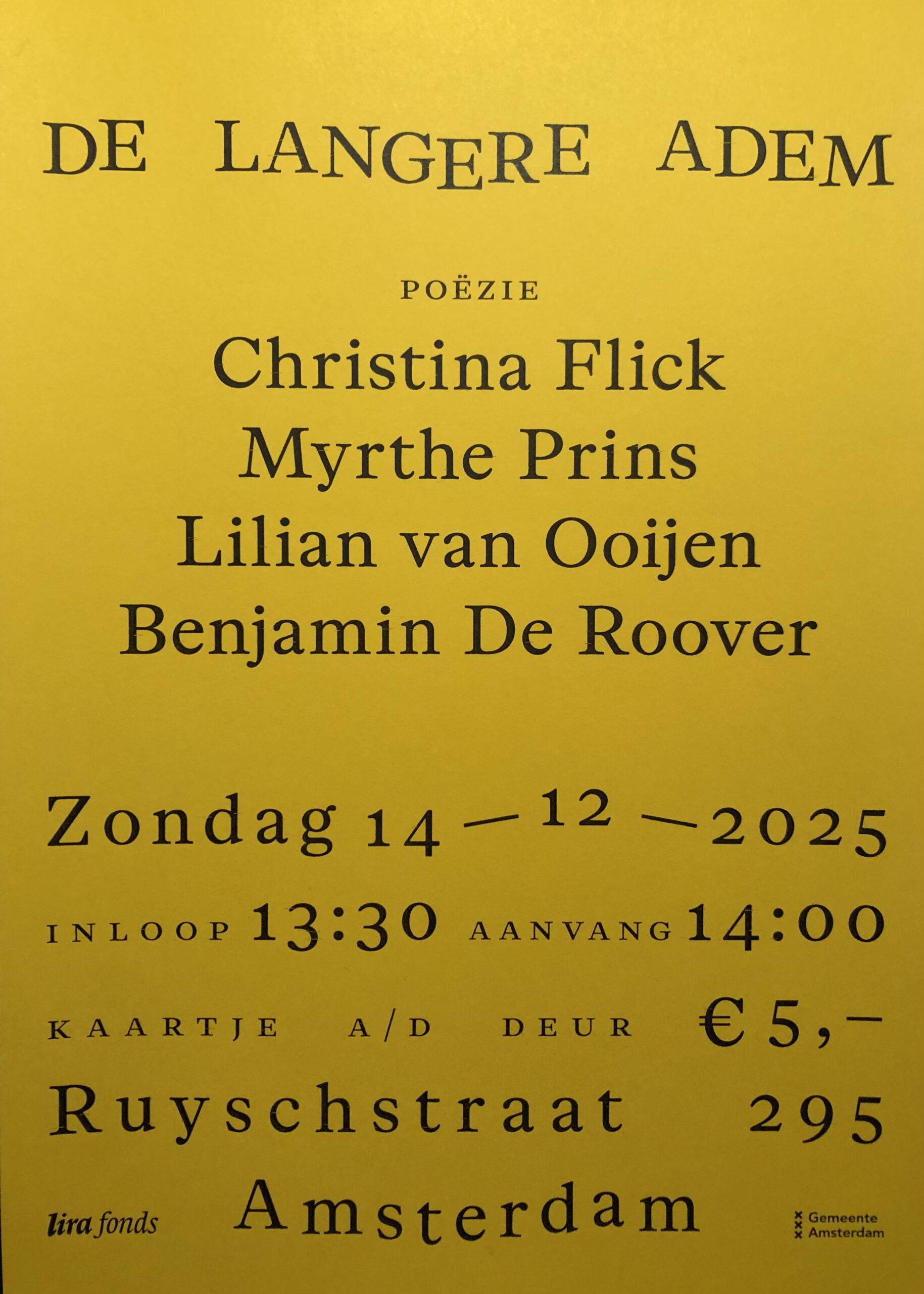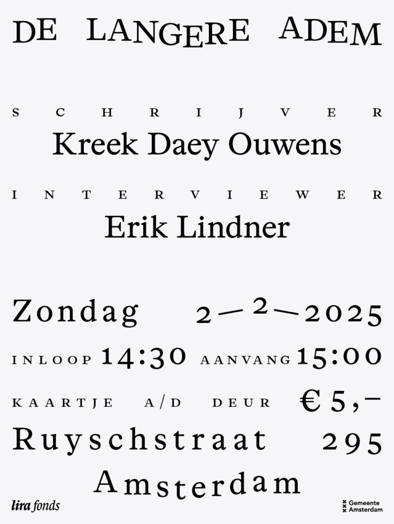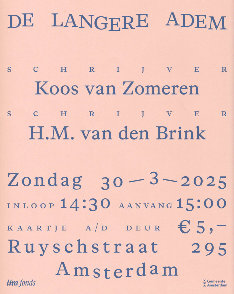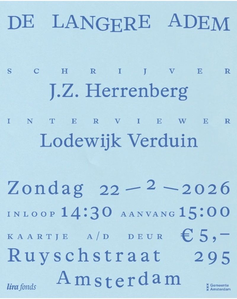 De Lange Adem, Ruyschstraat 295, Amsterdam. Aanvang 15:00. Zaal open 14:30.