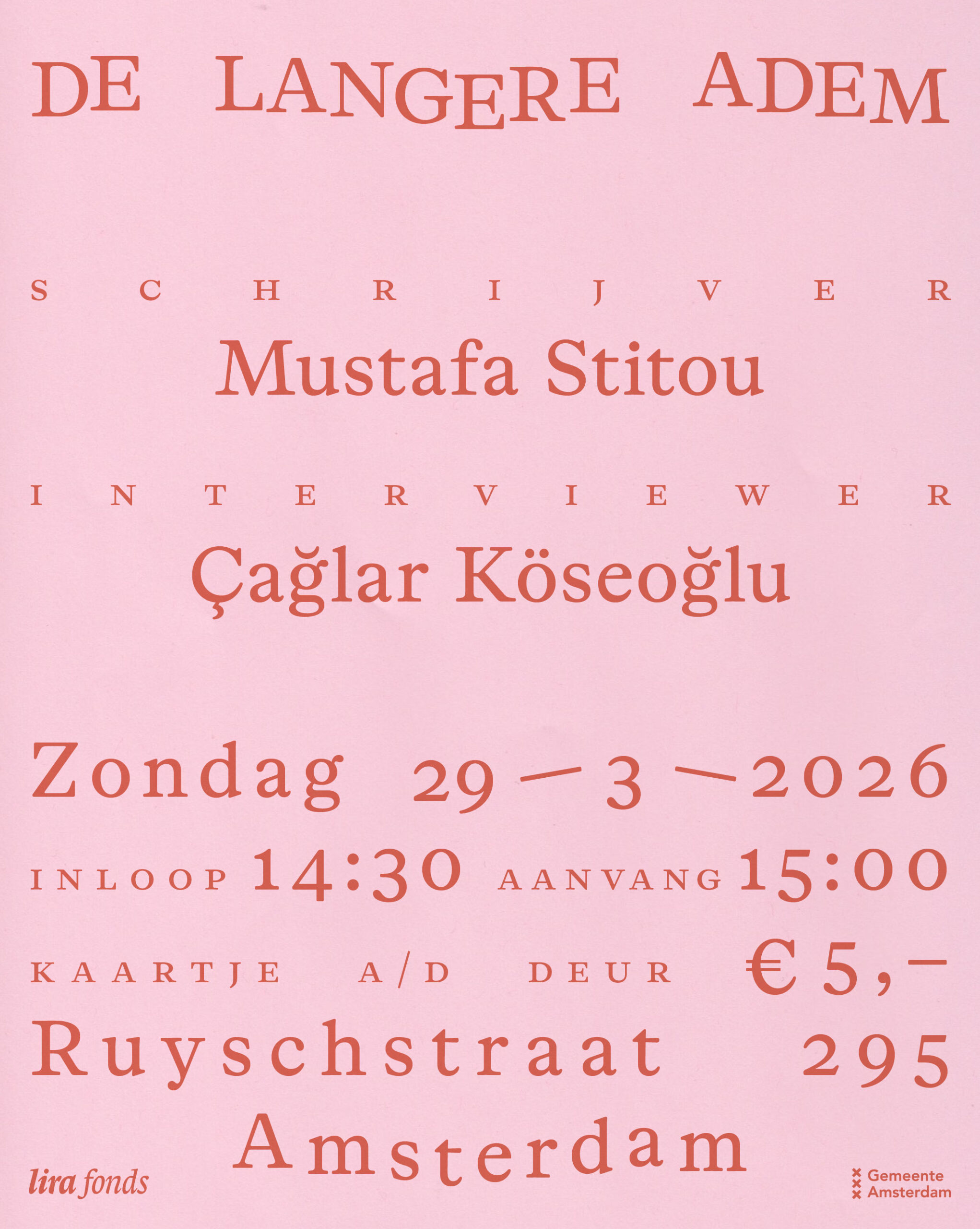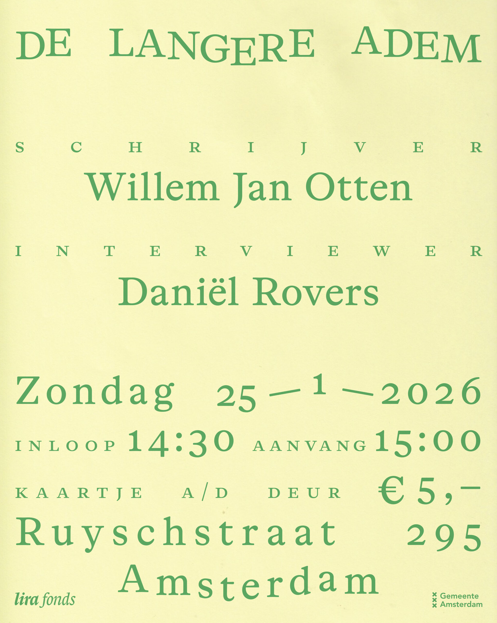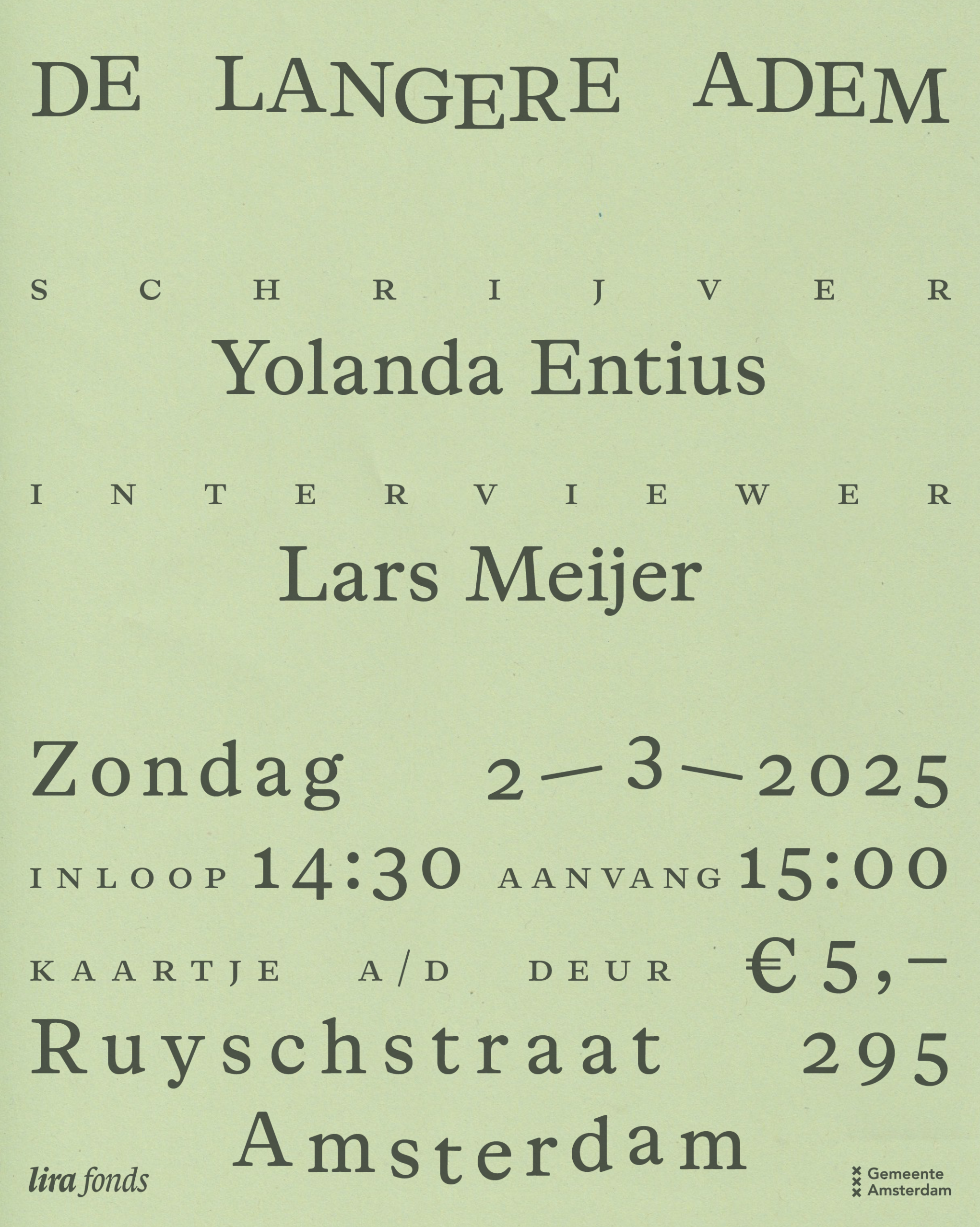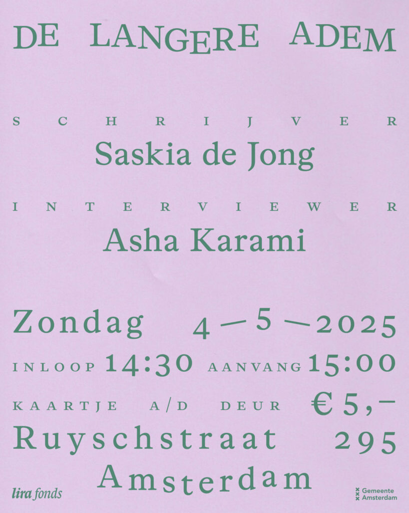 De Lange Adem, Ruyschstraat 295, Amsterdam. Aanvang 15:00. Zaal open 14:30.