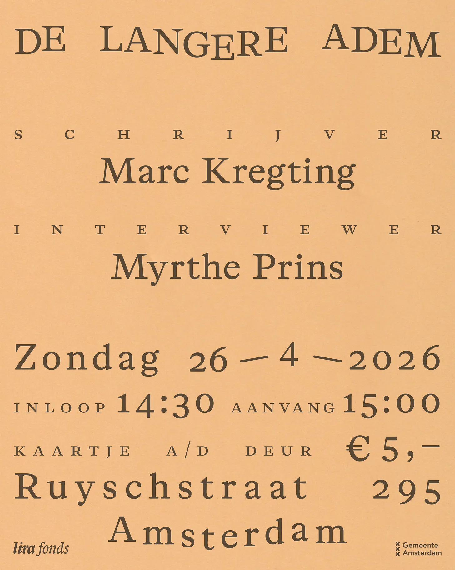 Zondag 26 april 2026. Schrijversgesprek tussen Marc Kregting en Myrthe Prins.